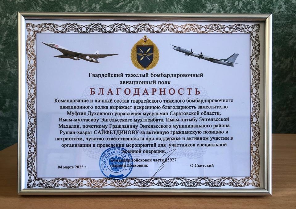 Заместитель муфтия ДУМ Саратовской области, имам-мухтасиб Энгельсского района Рушан-хазрат Сайфетдинов удостоен благодарности от гвардейского тяжелого бомбардировочного авиационного полка. Памятный документ за подписью командира воинской части, гвардии полковника О. Скитского был вручен религиозному деятелю 5 марта 2025 года, в месяц Рамадан.