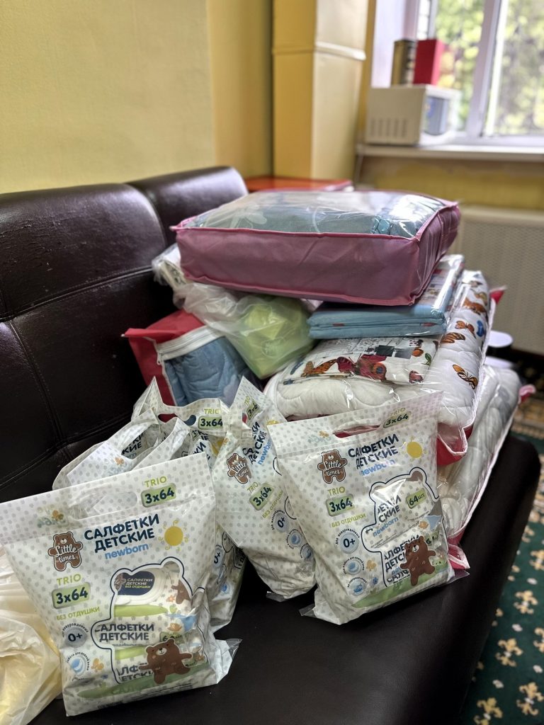 Затем с помощью неравнодушных были собраны наборы постельных комплектов, одноразовые пеленки, детские гигиенические и дезинфицирующие салфетки, детское мыло, шампуни, пенки для купания, детское питание, канцтовары. Таким образом были скомплектованы первые коробки с необходимым для отправки.