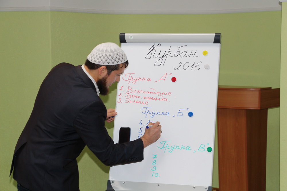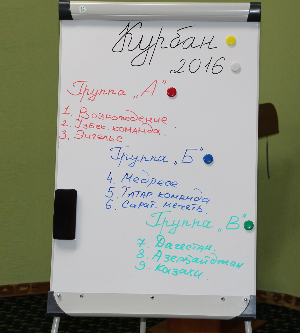 В ходе жеребьевки почетные гости вместе с собравшимися спортсменами распределили десять мусульманских команд на три группы. В первой из них сыграют «Возрождение», «Энгельс», узбекская и арабская сборные. Во второй встретятся команды Саратовской соборной мечети, медресе «Шейх Саид» и татарской молодежи. А в последней группе за победу поборются самые сильные команды прошлых турниров – казахи, азербайджанцы и дагестанцы, являющиеся многократными чемпионами и призерами предыдущих лет. В свою очередь победители внутригрупповых игр выйдут в финал и сразятся друг с другом за первое место.