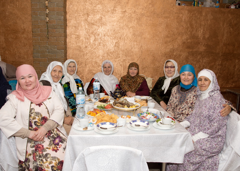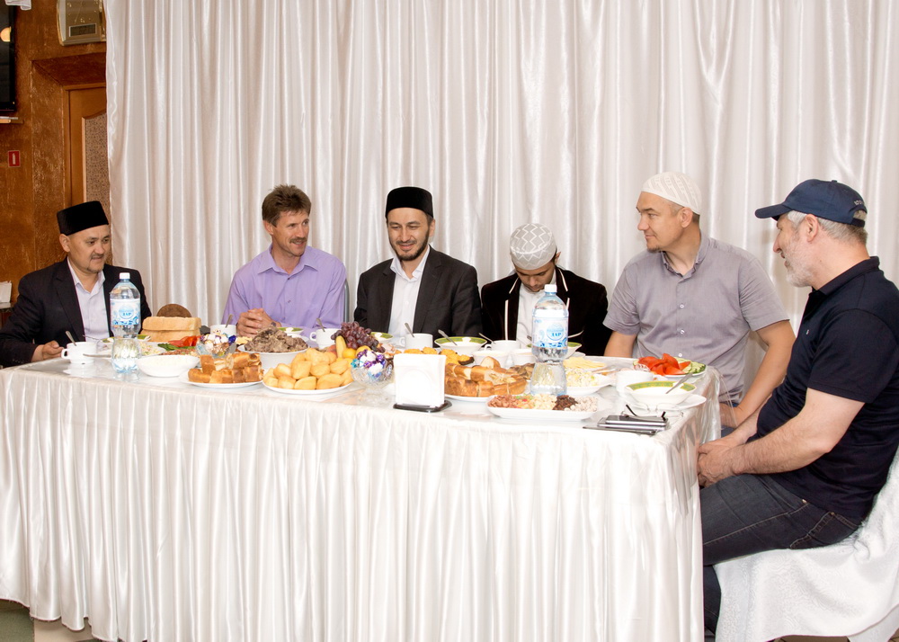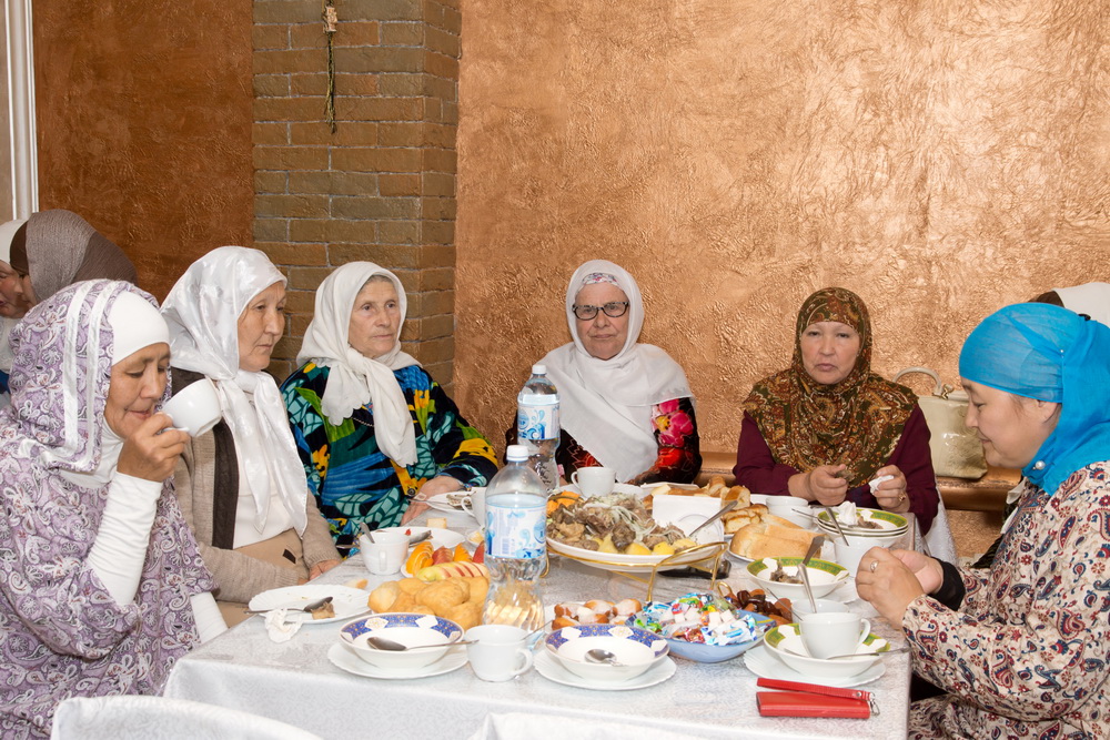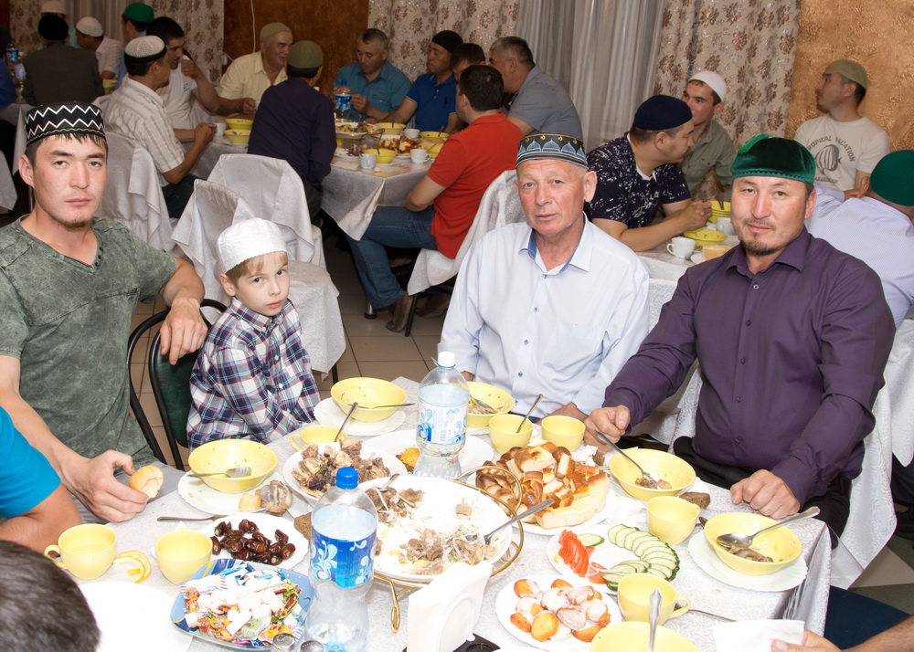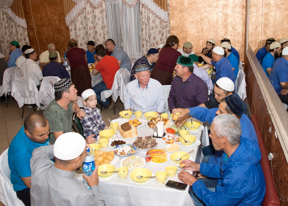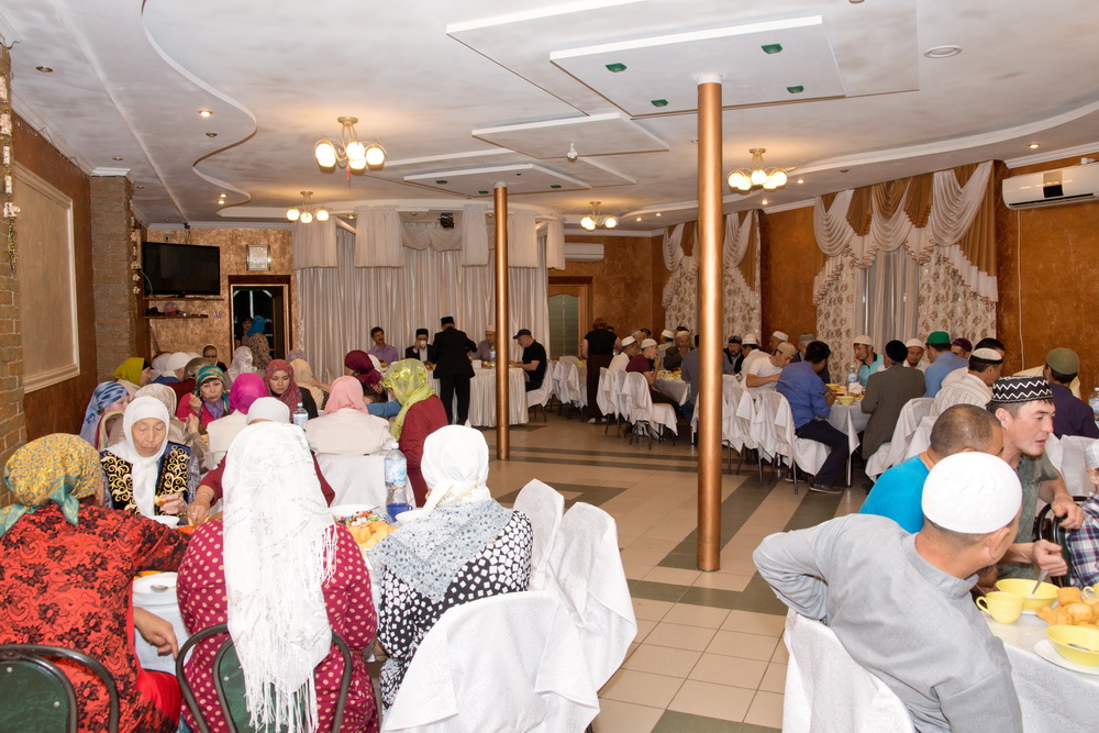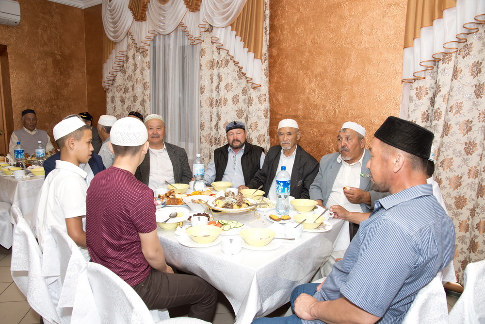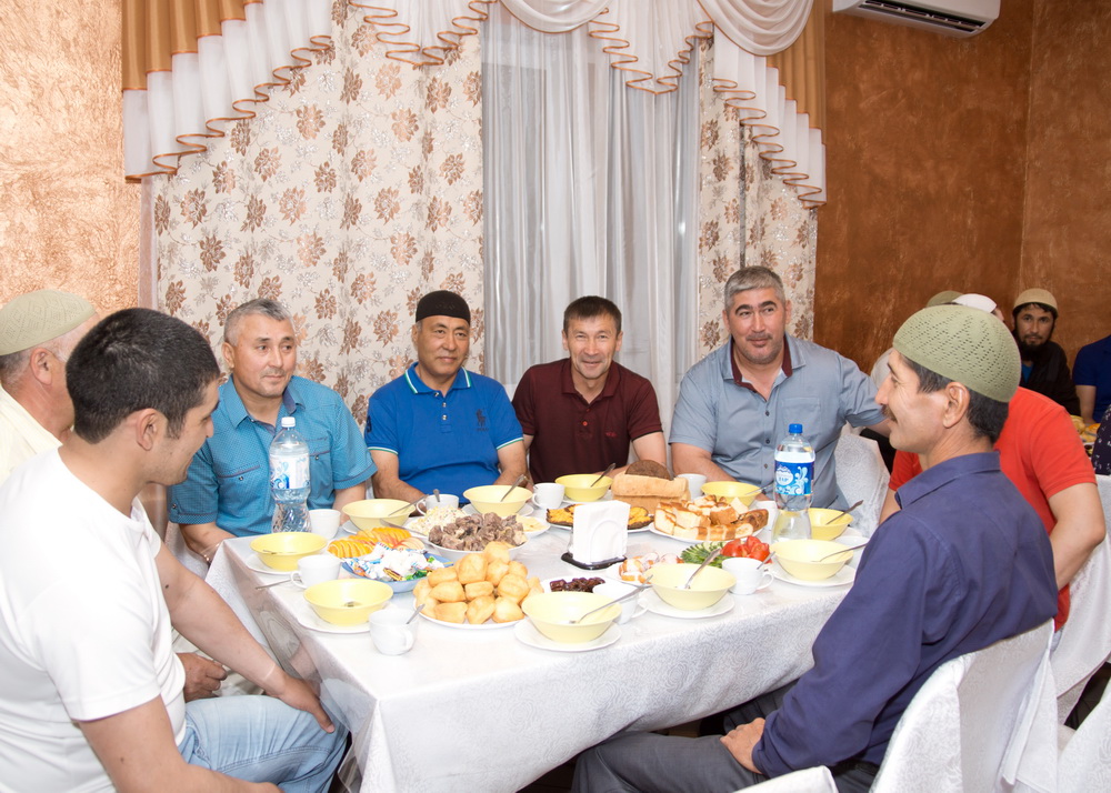 В местной мечети постящиеся перед разговением вознесли коллективное дуа, прося о прощении и помощи Всевышнего Аллаха. После они совершили Магриб-намаз, а затем отправились в кафе, где для всех гостей были накрыты столы с традиционными блюдами казахской кухни.