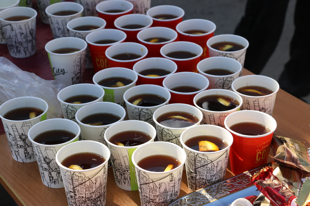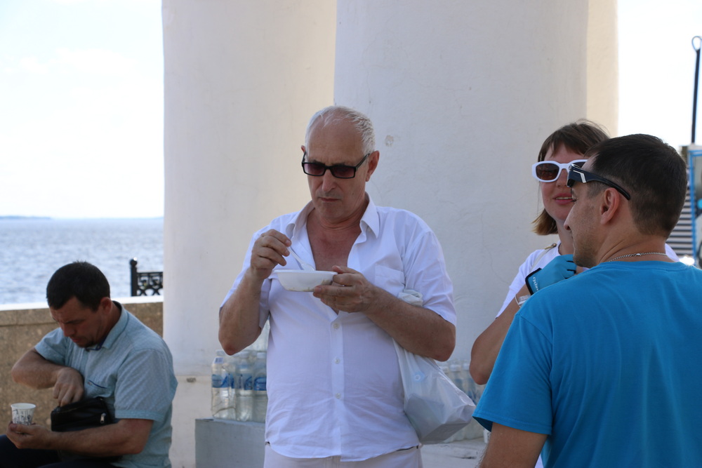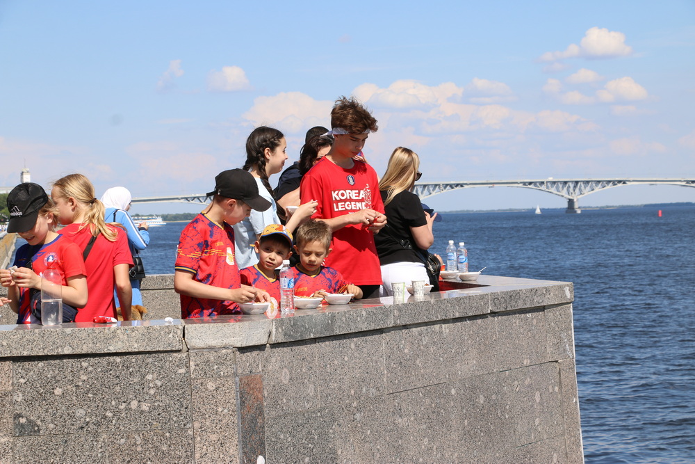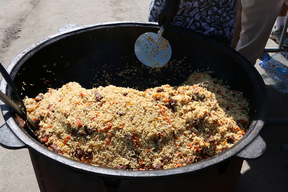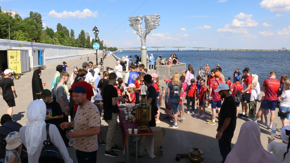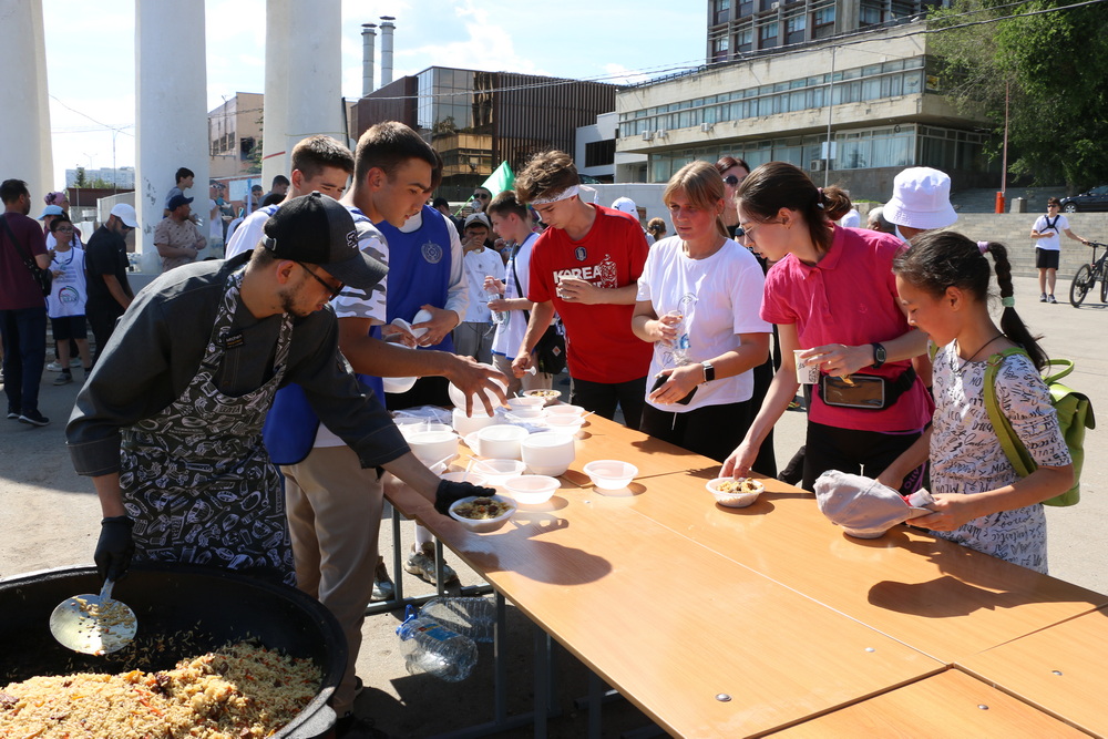 Финишировали участники у Ротонды, где их ждал казан с настоящим узбекским пловом, приготовленным на костре, а также самовары на дровах с ароматным травяным чаем. Отведать угощение могли как участники забега, так и все жители города, гуляющие в это время по набережной Саратова. Всего было роздано около 300 порций сытного восточного блюда.